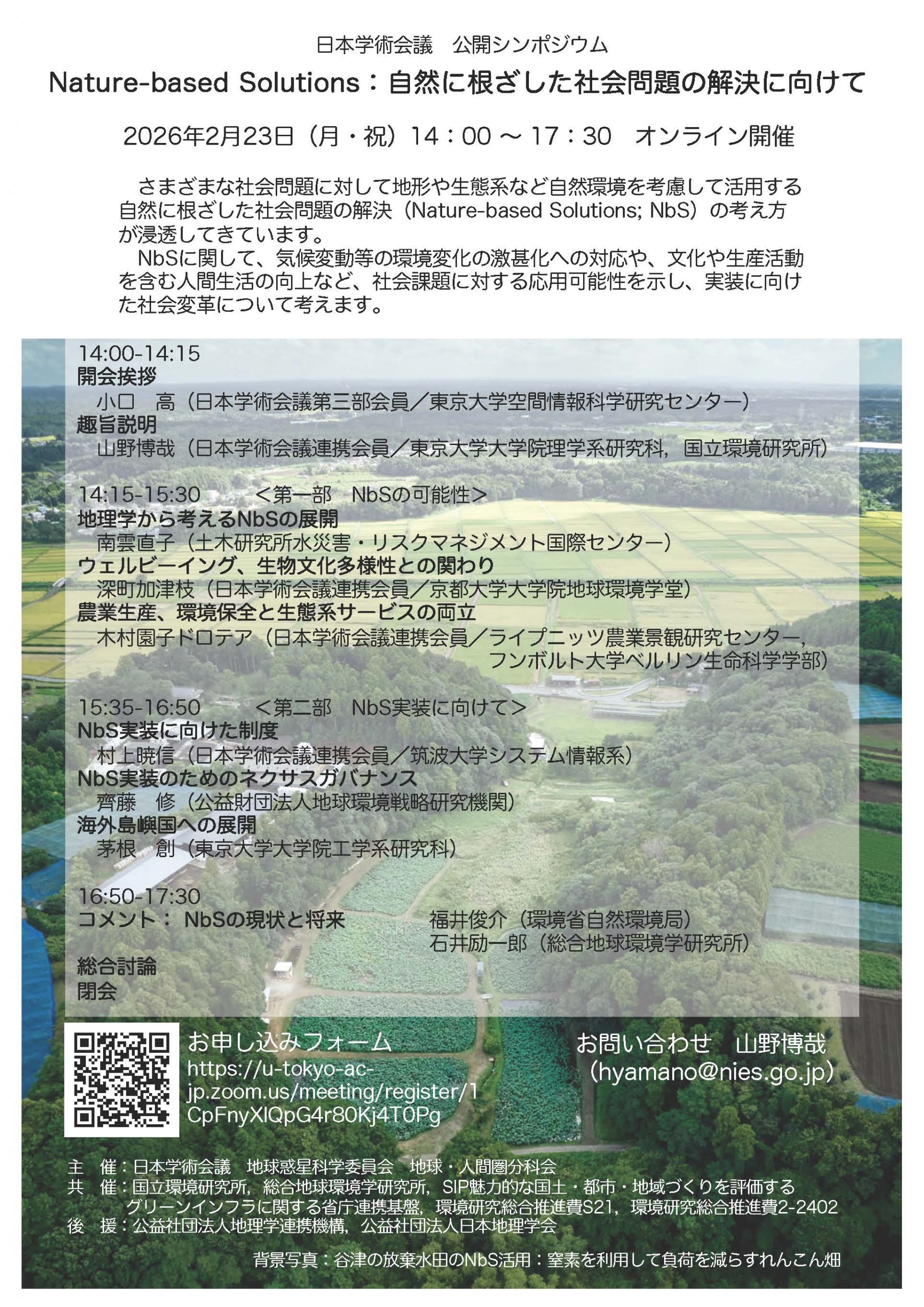 | 2026年2月23日(月・祝) 14:00~17:30 | 日本学術会議公開シンポジウム 会場:オンライン開催 主催:日本学術会議地球惑星科学委員会地球・人間圏分科会 共催:国立環境研究所,総合地球環境学研究所,SIP魅力的な国土・都市・地域づくりを評価するグリーンインフラに関する省庁連携基盤,環境研究総合推進費S21,環境研究総合推進費2-2402 | テーマ:Nature-based Solutions:自然に根ざした社会問題の解決に向けて 開会挨拶:小口高(東京大学) 趣旨説明:山野博哉(東京大学,国立環境研究所) 講演: 「地理学から考えるNbSの展開」南雲直子(土木研究所) 「ウェルビーイング、生物文化多様性との関わり」深町加津枝(京都大学) 「農業生産、環境保全と生態系サービスの両立」木村園子ドロテア(ライプニッツ農業景観研究センター・フンボルト大学) 「NbS実装に向けた制度」村上暁信(筑波大学) 「NbS実装のためのネクサスガバナンス」齊藤修(地球環境戦略研究機関) 「海外島嶼国への展開」茅根創(東京大学) コメント: 福井俊介(環境省) 石井励一郎(総合地球環境学研究所) | ![]() | 参加者:106名 URL: https://www.scj.go.jp/ja/event/2026/395-s-0223.html |